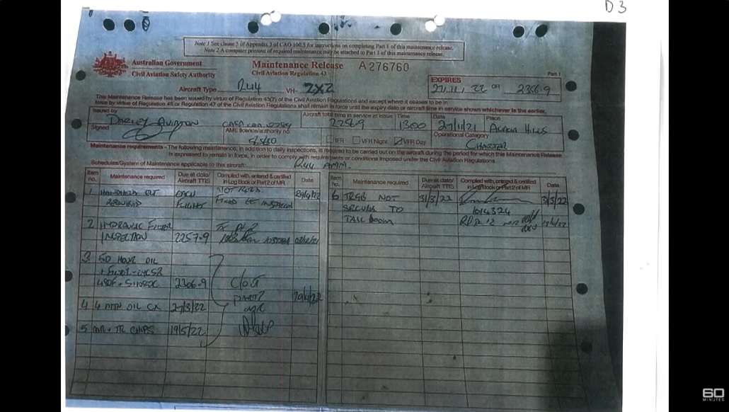 And they’re alleged they talked about the original maintenance release for the crash chopper, this is a document that outlines flight hours ,flight times, where and when they were taken and who was piloting them.