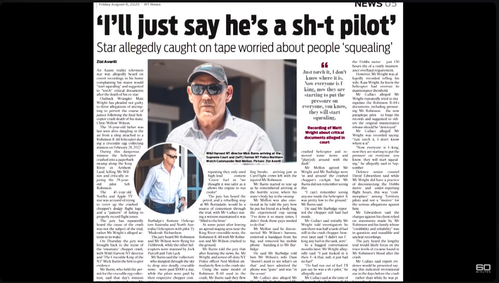 Investigators had been trying to get answers for friends,family members and territorians devastated by the crash,they suspected Matt Wright was trying to stand in their way,the outback wrangler faces legal rekoning,he’s not accused of causing the 2022 crash,he’s accused of attempting to pervert the course of justice in its aftermath,the man famed for turbocharging top-end tourism could go to prison.