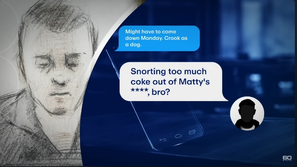Many of the text messages read out in court were in some way about cocaine . like this message in 2018.”you getting more coke?” then from Seb in 2019,footy players in town and awnt bags”.