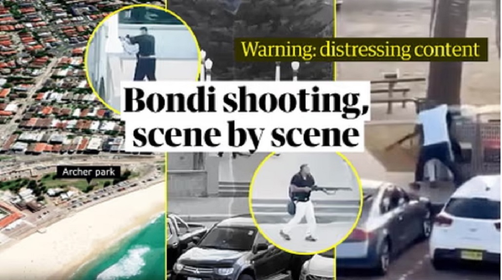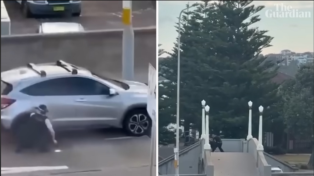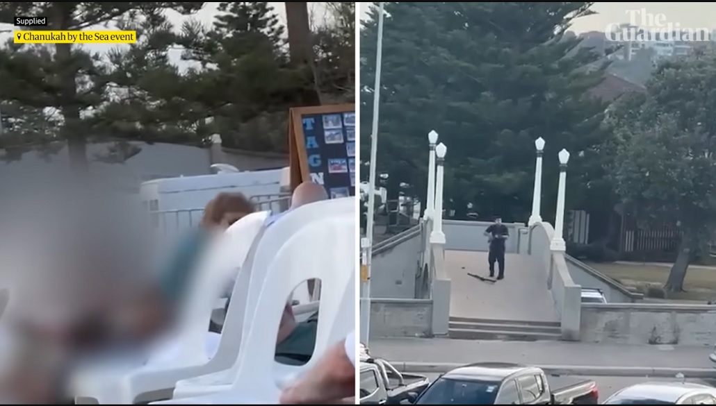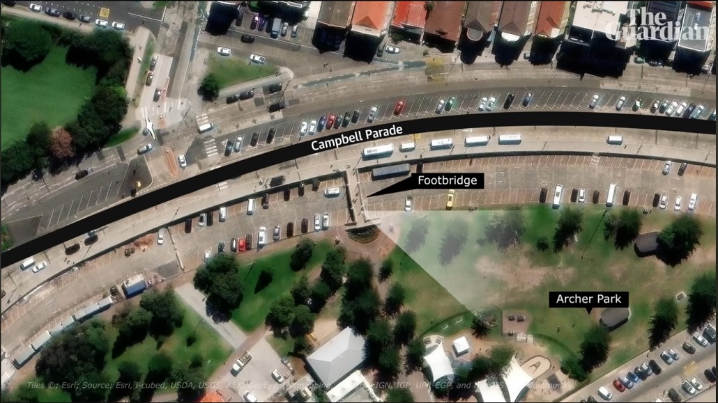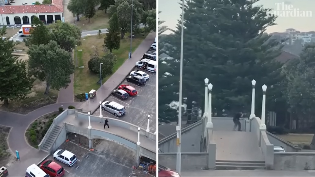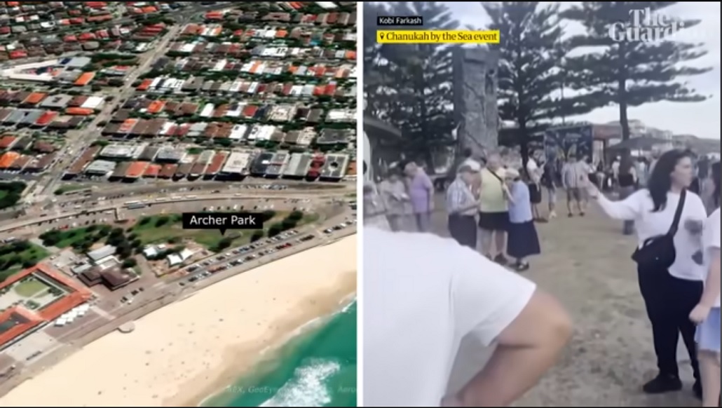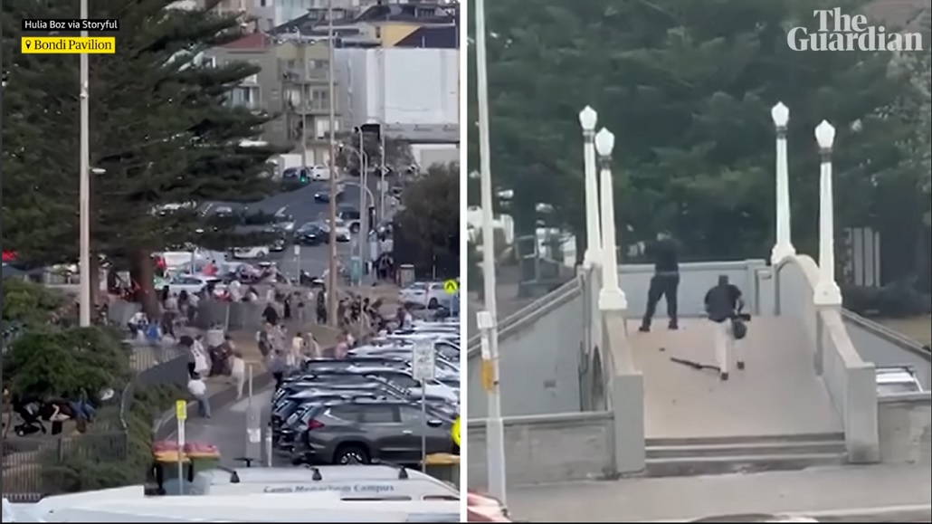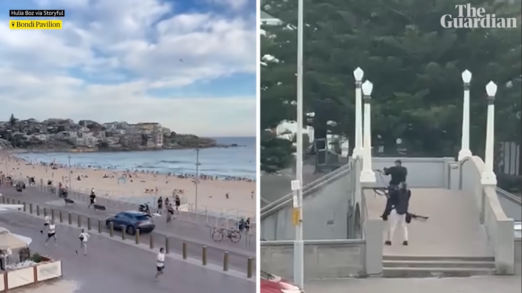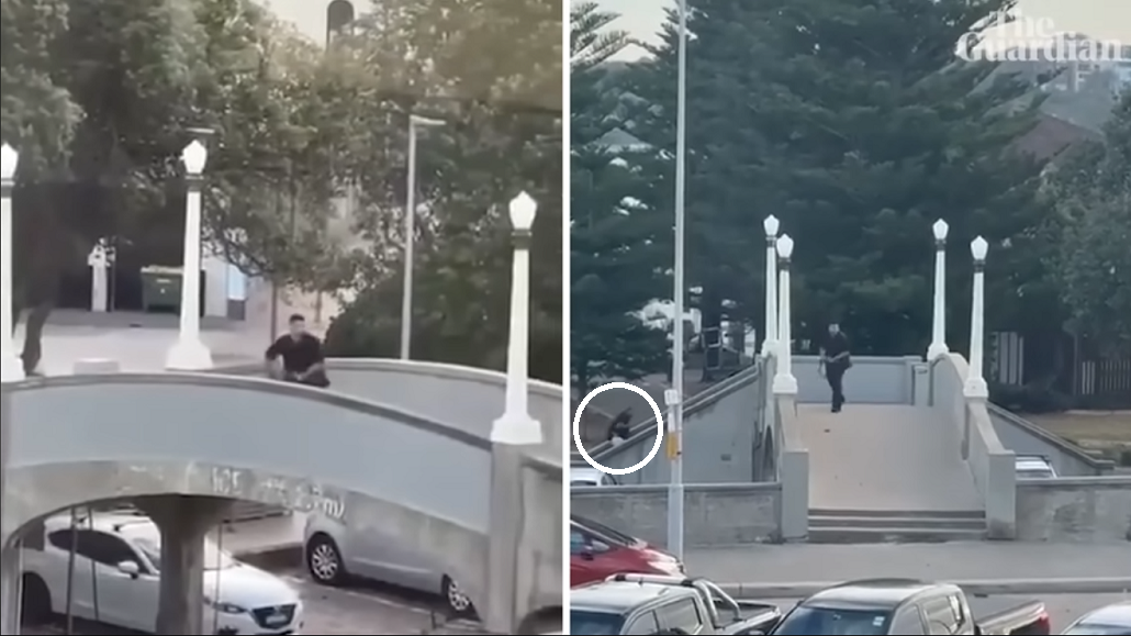 At 6.41pm Sunday, on a footbridge overlooking Archer Park at Bondi beach, two gunmen opened fired in what would become Australia’s worst mass shooting since the Port Arthur massacre. Guardian Australia’s video team has verified and pieced together footage posted to social media, showing the attack from different angles