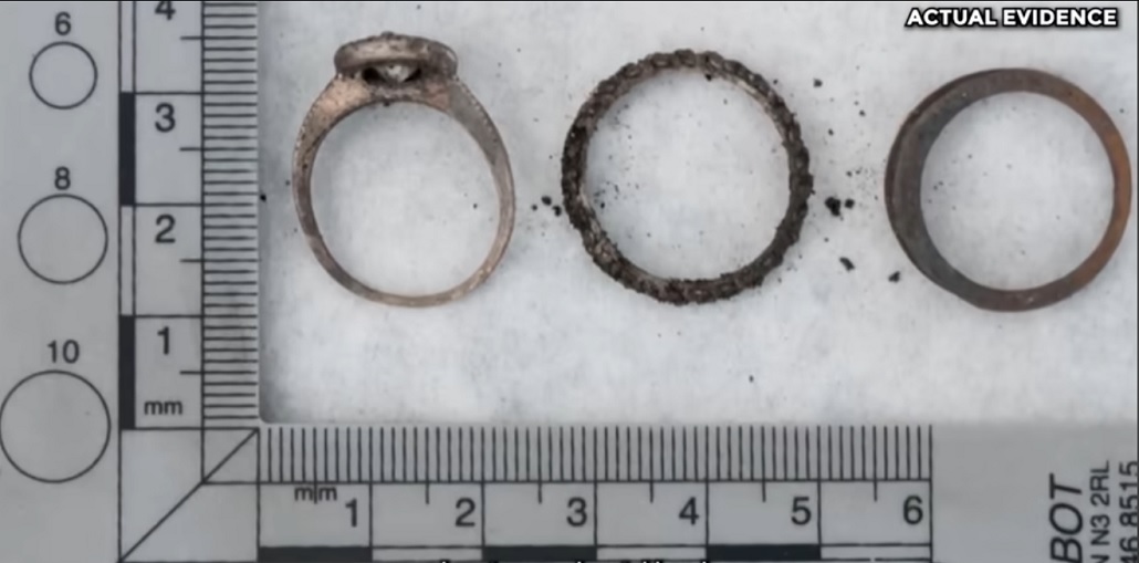 Upon digging further among the ashes , somethinhg else surfaced : a burnt warped metal band ,presumed to be a ring, something that had the potential to be a damning piece of evidence, but it was  too far destroyed to retrieve DNA.