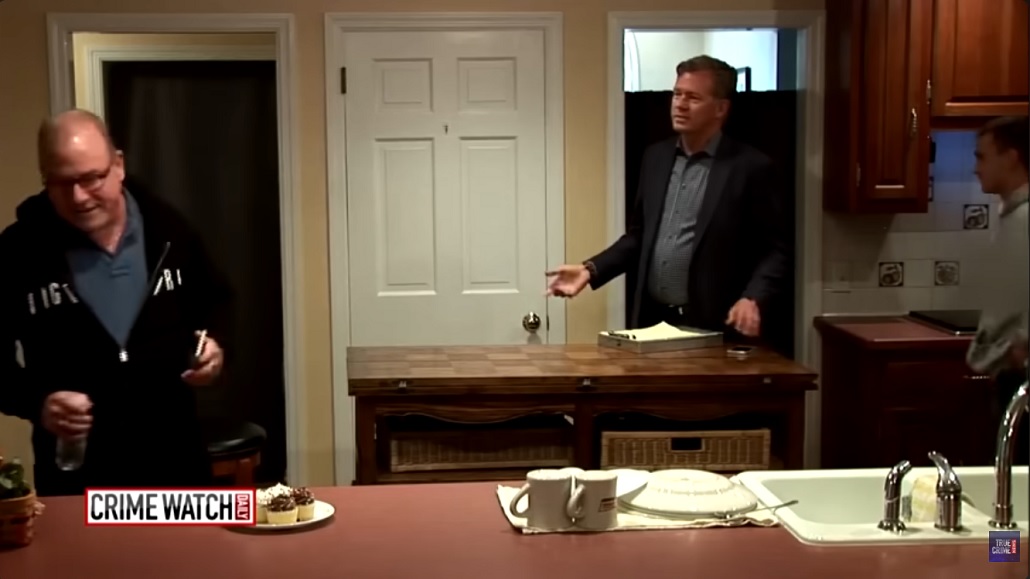 As detectives wait for a judge to issue a search warrant for the hotel room , they start the booking process and the line of questioning he wouldn’t faced in the kitchen with Chris Hansen .