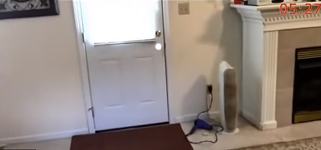 through the hole in the back door they perceived heat emanating from the interior and a stange smell.a police officer found away to open the garage´s door and they entered the house.inside the house , they notice the high temperature and a dog barking from inside a room.
