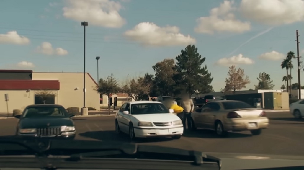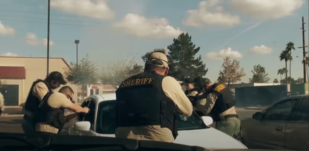 As they draw up the undercover cops back away from the scene allowing the armed deputies to launch their assault.