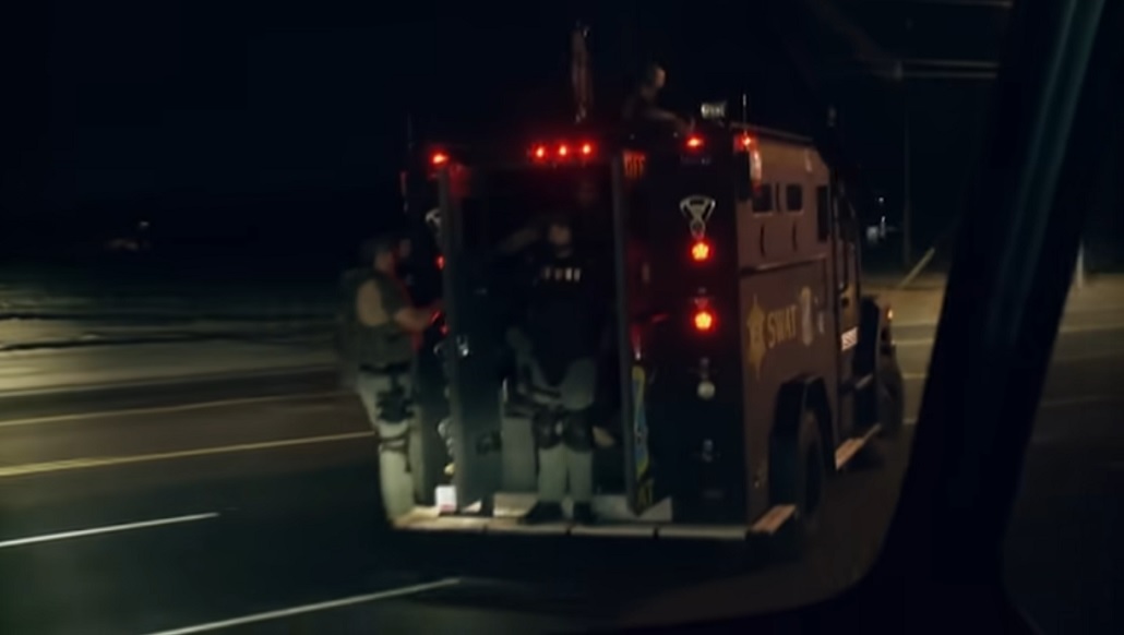 The three SWAT 4×4 is moving quickly converging in the car park and surrounding the suspect’s vehicle.