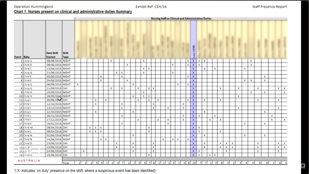 As well as a roster that showed she was the only nurse on duty for all suspicious deaths.